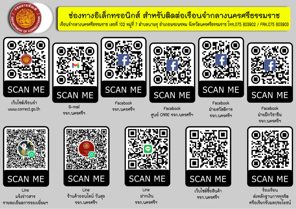 075-803905 ต่อ 202/106 งานเยี่ยมญาติ075-803905 ต่อ 402 งานเงินฝาก075-803905 ต่อ 617 ฝ่ายสงเคราะห์ผู้ต้องขัง ( ร้านค้าเรือนจำ)075-803905 ต่อ 105 ฝ่ายทัณฑปฏิบัติ075-803905 ต่อ 302 ฝ่ายบริหารทั่วไป