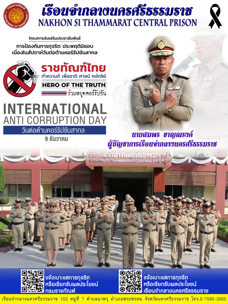 วันศุกร์ที่ 28 พฤศจิกายน 2568 นายสมพร ชาญณรงค์ ผู้บัญชาการเรือนจำกลางนครศรีธรรมราช พร้อมผู้อำนวยการส่วนและเจ้าหน้าที่เรือนจำกลางนครศรีธรรมราช แสดงสัญลักษณ์ “ไขว้มือ” ร่วมต่อต้านการทุจริตคอร์รัปชันทุกรูปแบบภายใต้แนวคิด “ราชทัณฑ์ ร่วมใจรักชาติ รักแผ่นดิน ปลูกจิตสำนึก จริยธรรม ความโปร่งใส เพื่อความมั่นคงของชาติ” ส่งเสริมประชาสัมพันธ์การป้องกันการทุจริต ประพฤติมิชอบ เนื่องในวันต่อต้านคอร์รัปชันสากล ณ บริเวณด้านหน้าเรือนจำกลางนครศรีธรรมราช