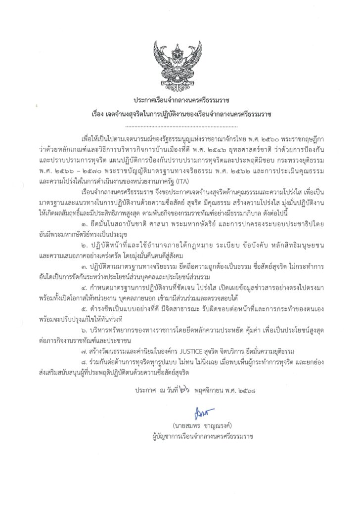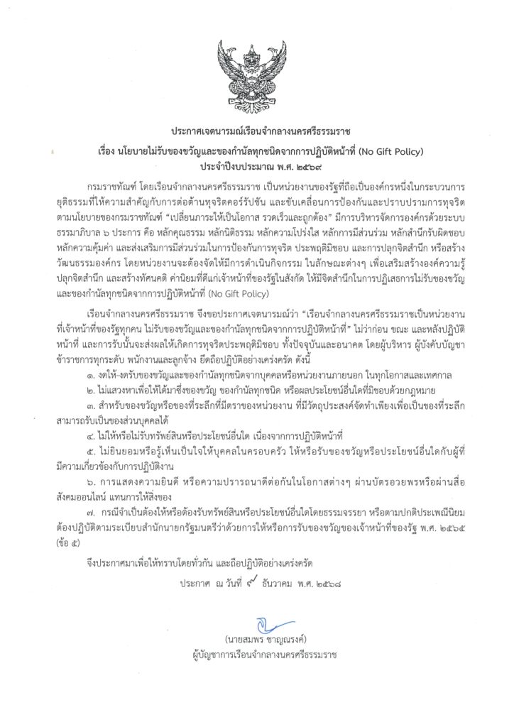 นายสมพร ชาญณรงค์ ผู้บัญชากาเรือนจำกลางนครศรีธรรมราช ประกาศเจตนารมณ์ No Gift Policy การไม่รับของขวัญและของกำนัลทุกชนิดจากการปฏิบัติหน้าที่ ประจำปีงบประมาณ พ.ศ. 2569 เพื่อรณรงค์ให้ข้าราชการและบุคลากรเรือนจำกลางนครศรีธรรมราชไม่รับของขวัญและของกำนัลทุกชนิดจากการปฏิบัติหน้าที่ ทั้งในขณะ ก่อนและหลังการปฏิบัติหน้าที่ ที่จะส่งผลให้เกิดการทุจริตและประพฤติมิชอบ